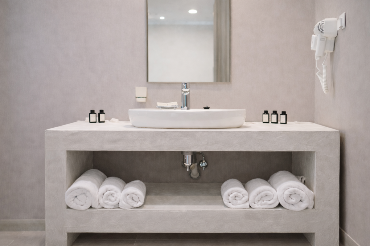 Однокомнатный номер с видом на первую виллу и подпорную стену,выше горный склон.