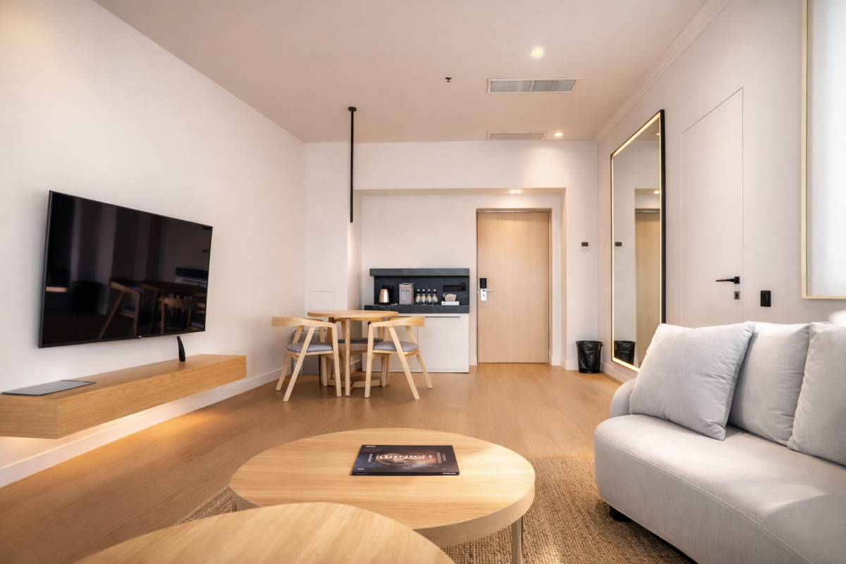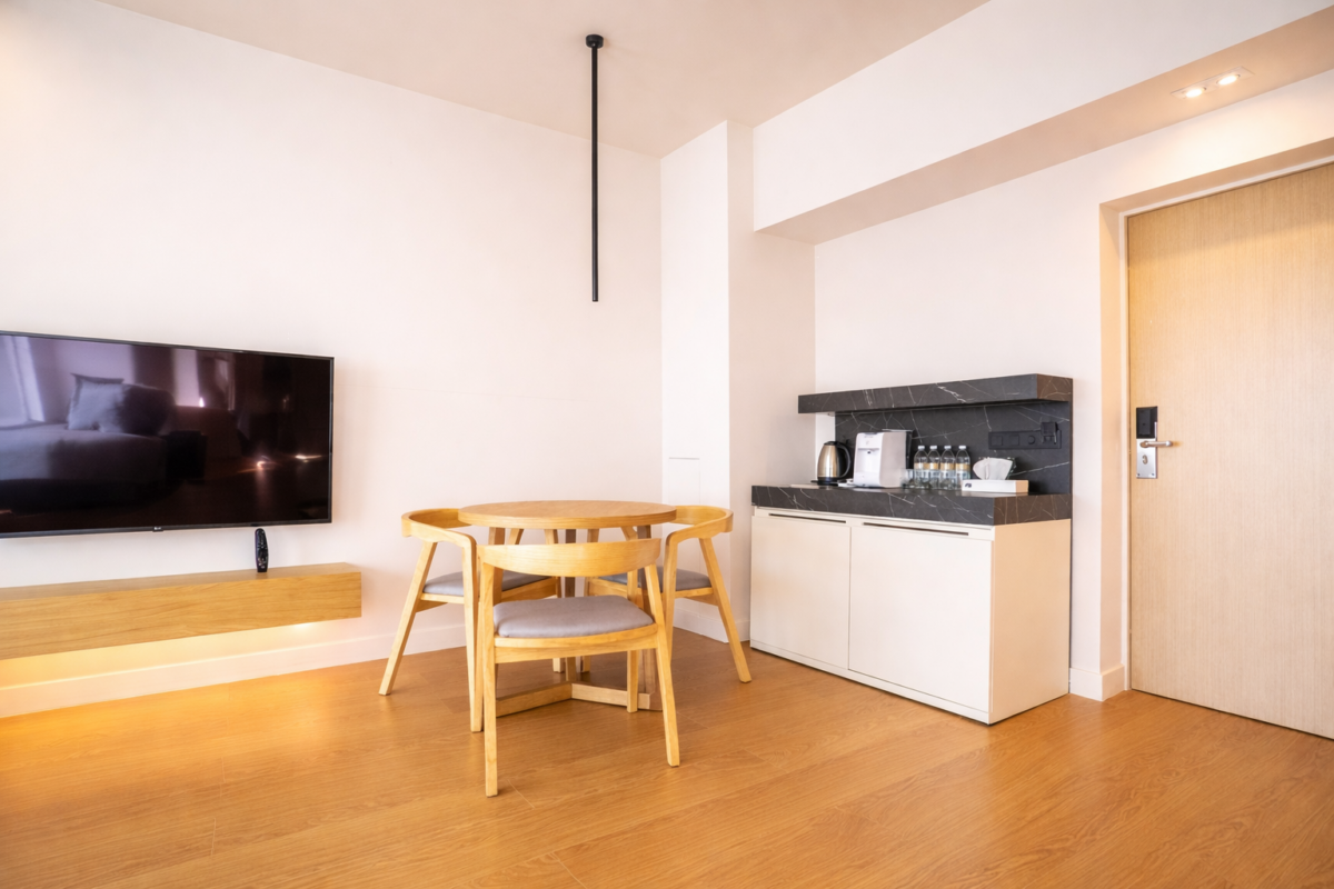 - Просторная гостиная — сердце номера, где утренний кофе и вечерние беседы наполнятся теплом и уютом.