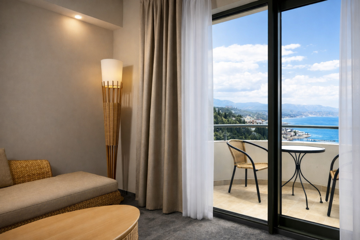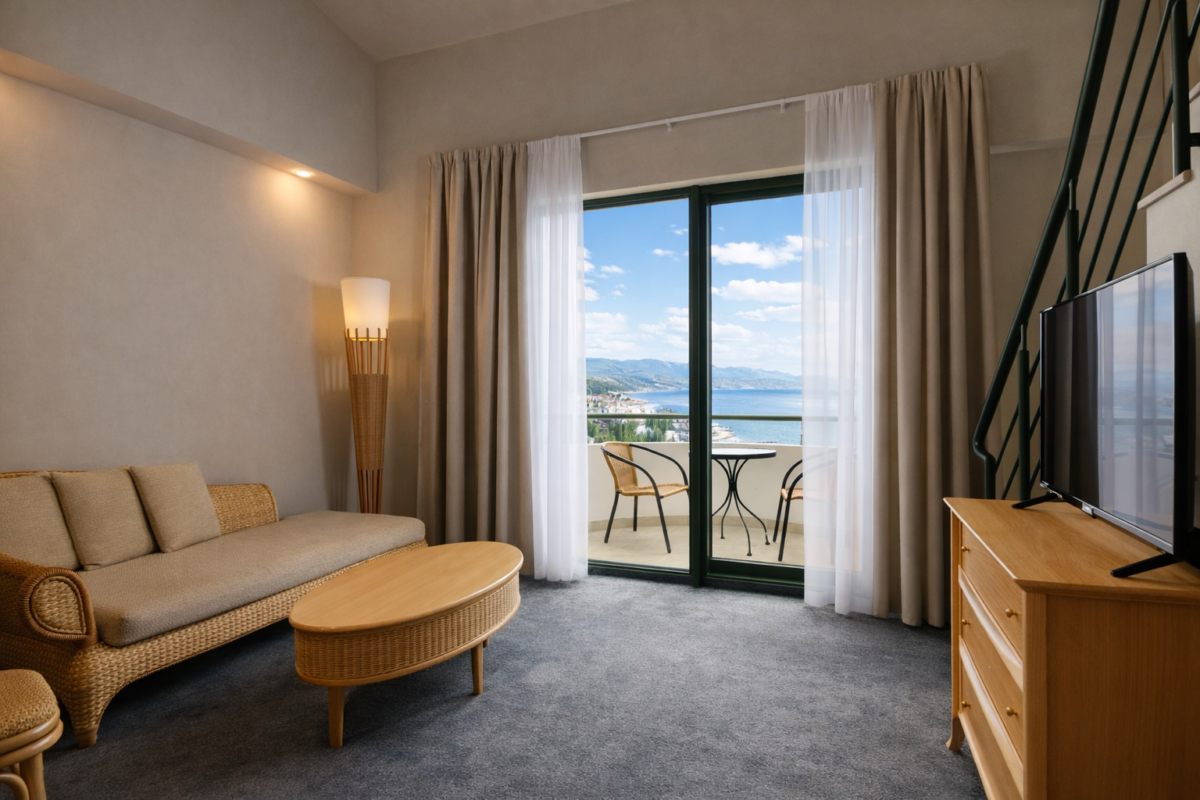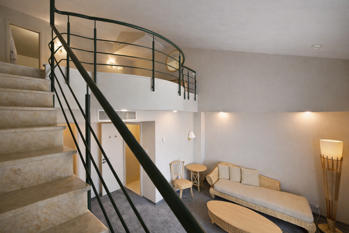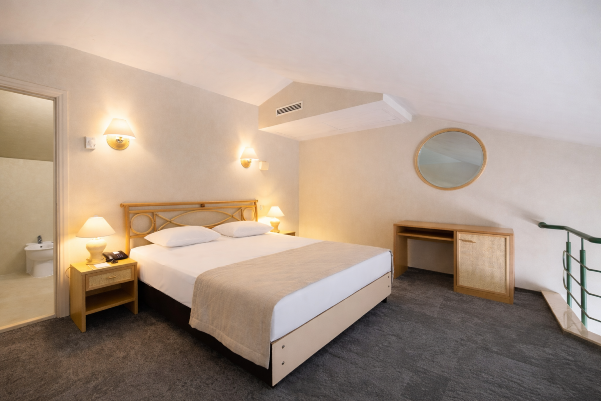Двухэтажный двухкомнатный номер общей площадью 50 м² с панорамным видом на море. Состоит из гостиной на нижнем этаже и спальни на верхнем. Верхний и нижний уровни номера соединены мраморной лестницей. На первом этаже номера расположен балкон с видом на море, туалетная комната. На втором этаже находится ванная комната, оснащенная душевой кабиной. Тип кровати – двуспальная.