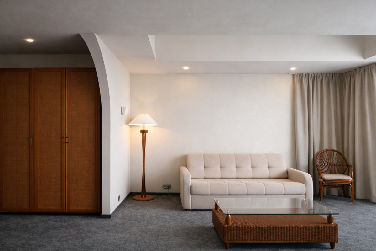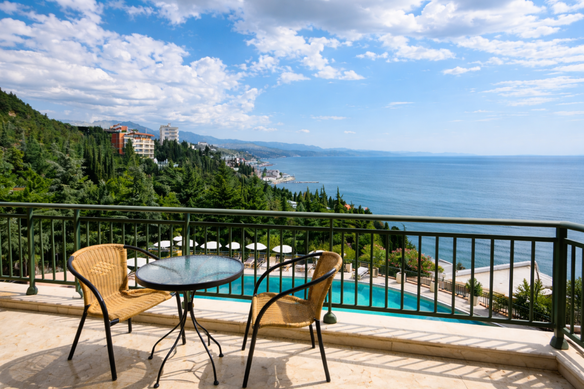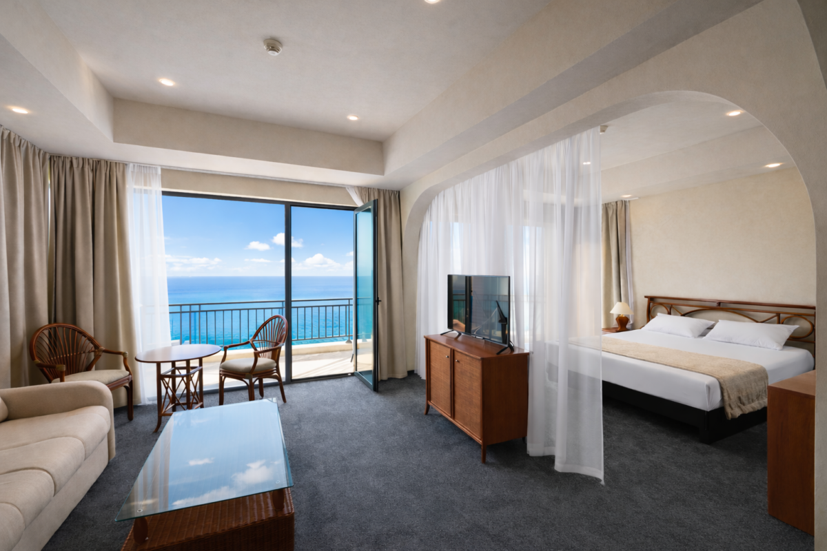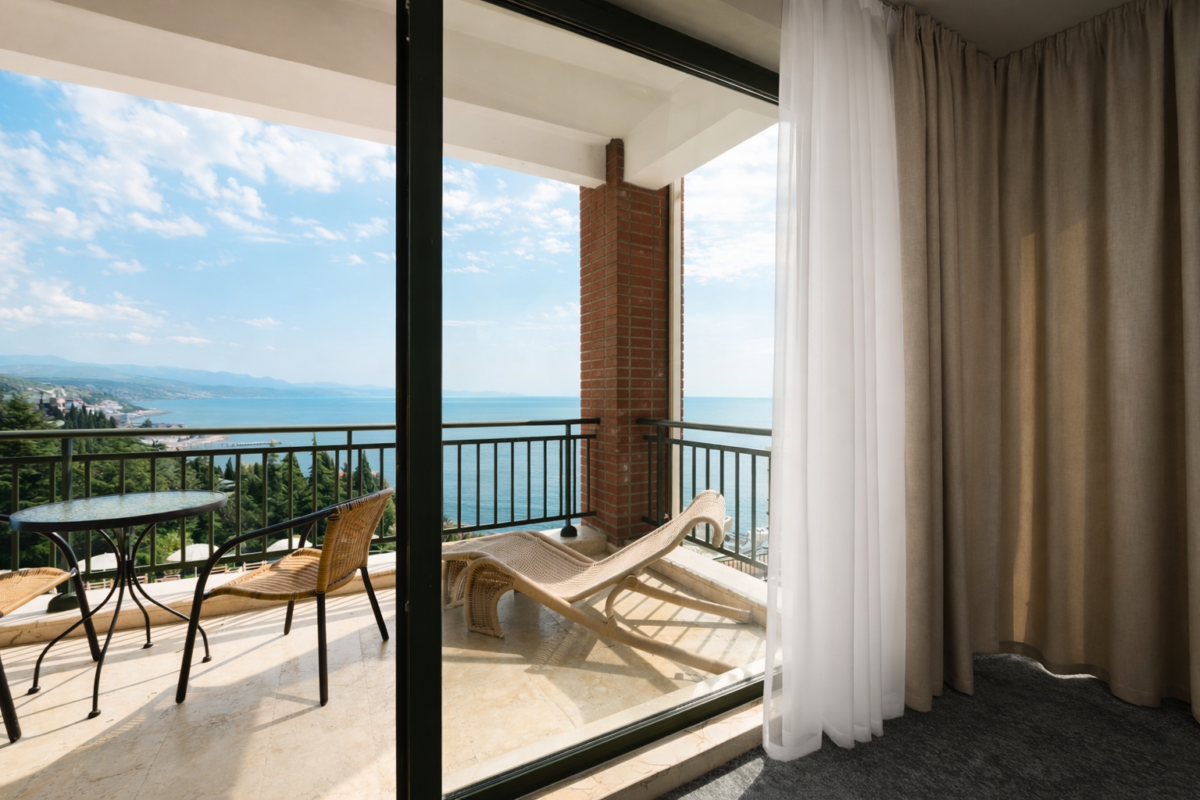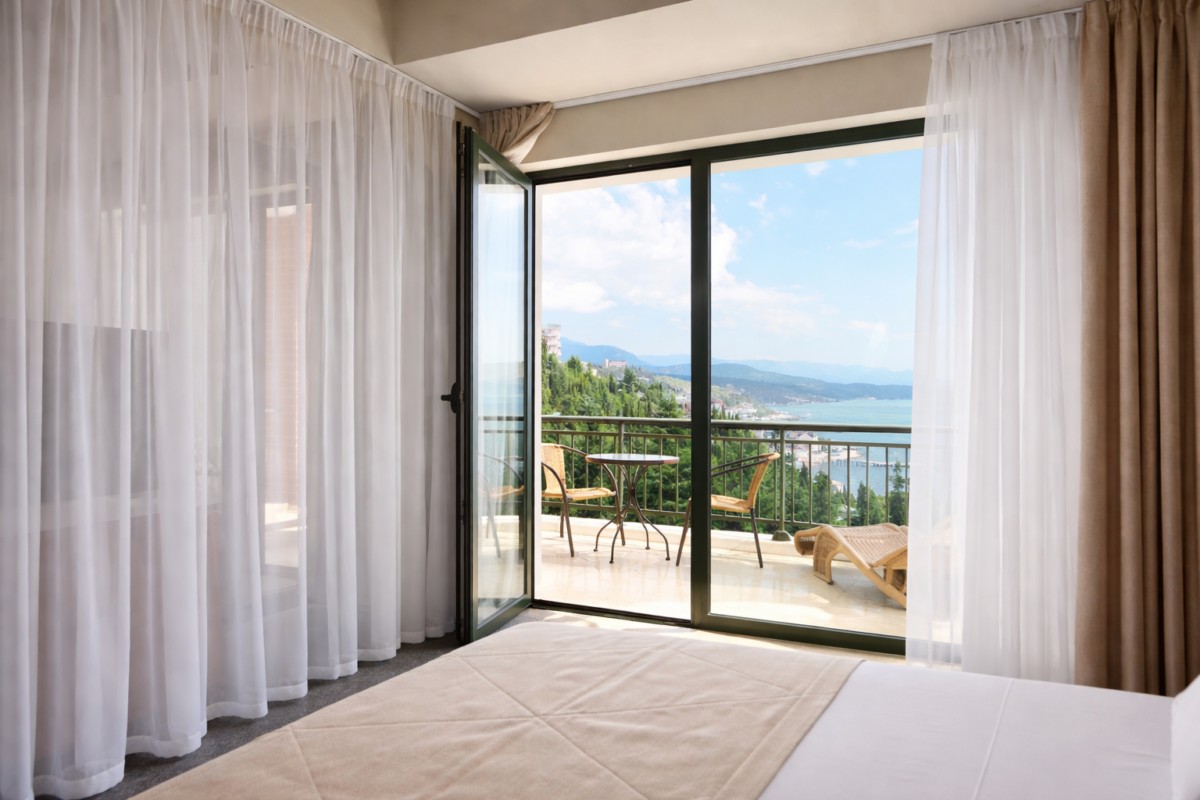 Просторный однокомнатный номер общей площадью 44 м². Номер условно разделен декоративной портьерой на две зоны: гостиную и спальную. Тип кровати – двуспальная. Номер с раскладным или с не раскладным диваном. Номер с большим балконом с видом на море и восточное побережье Крыма. Ванная комната оснащена душевой кабиной.