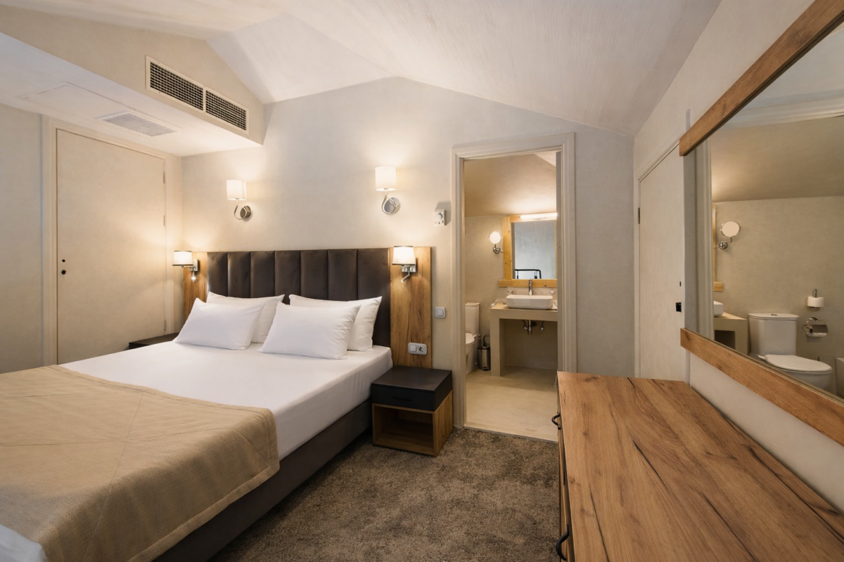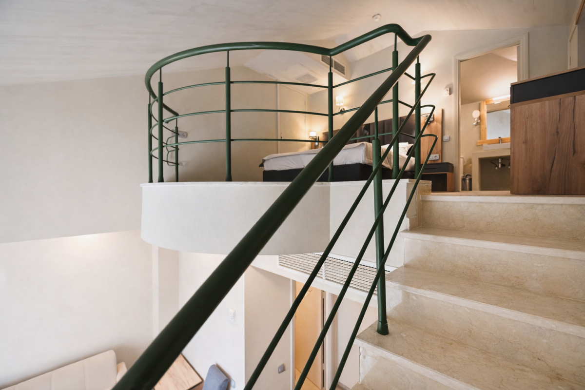 Двухэтажный номер общей площадью 42 м². Номер состоит из гостиной на нижнем этаже и спальни на верхнем. Верхний и нижний уровни номера соединены лестницей. На первом этаже номера расположен балкон с видом на море, есть туалетная комната. В гостиной установлен раскладной диван. На втором этаже находится ванная комната, оснащенная душевой кабиной. Тип кровати – двуспальная.