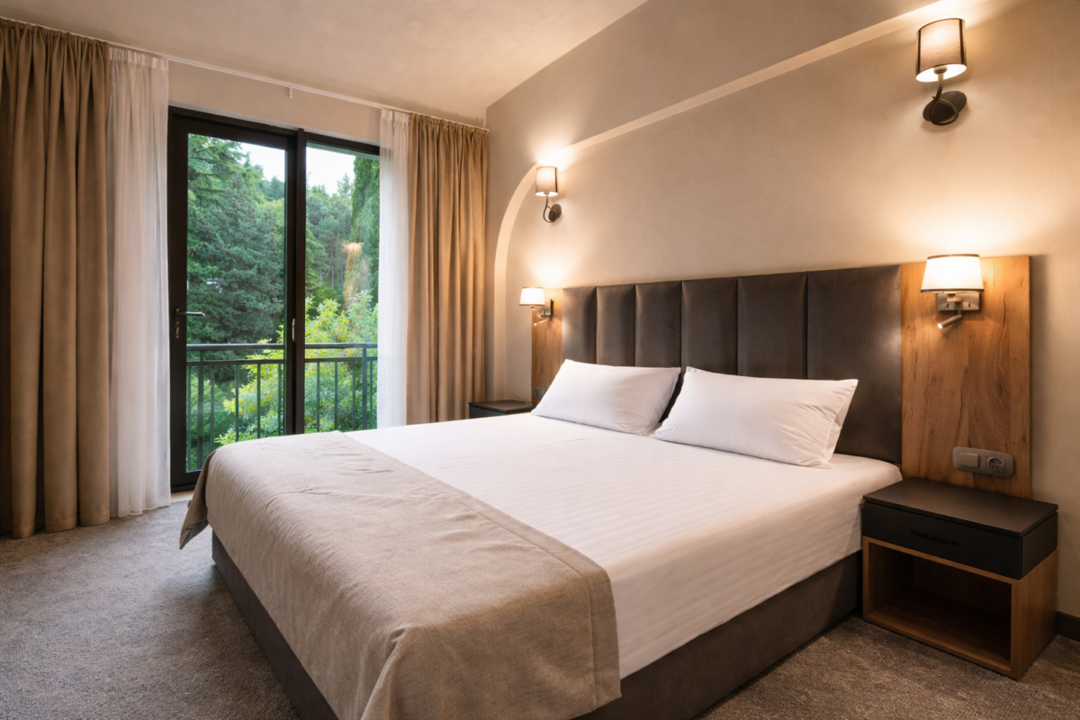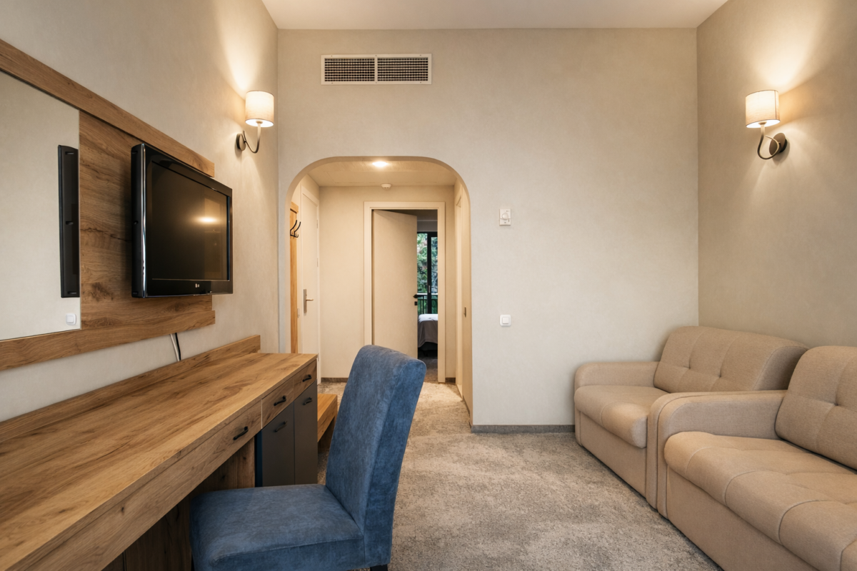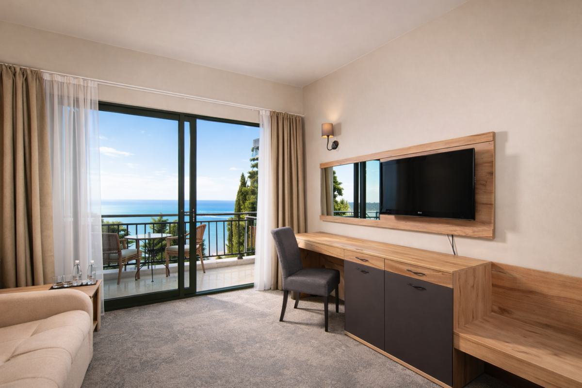 Двухкомнатный номер общей площадью от 37 до 41 м² с видом на море, с балконом. Балкон в номерах на первом этаже находится на уровне с газоном. Из гостиной открывается вид на море, из спальни – на парковую зону. Тип кровати – двуспальная. В гостиной установлено раскладное кресло 80х190. В ванной комнате находится ванна.