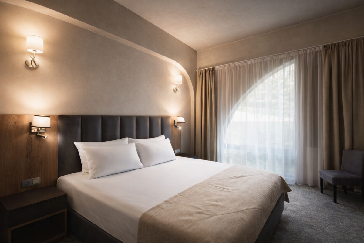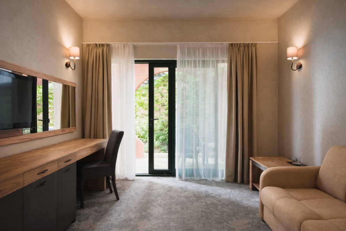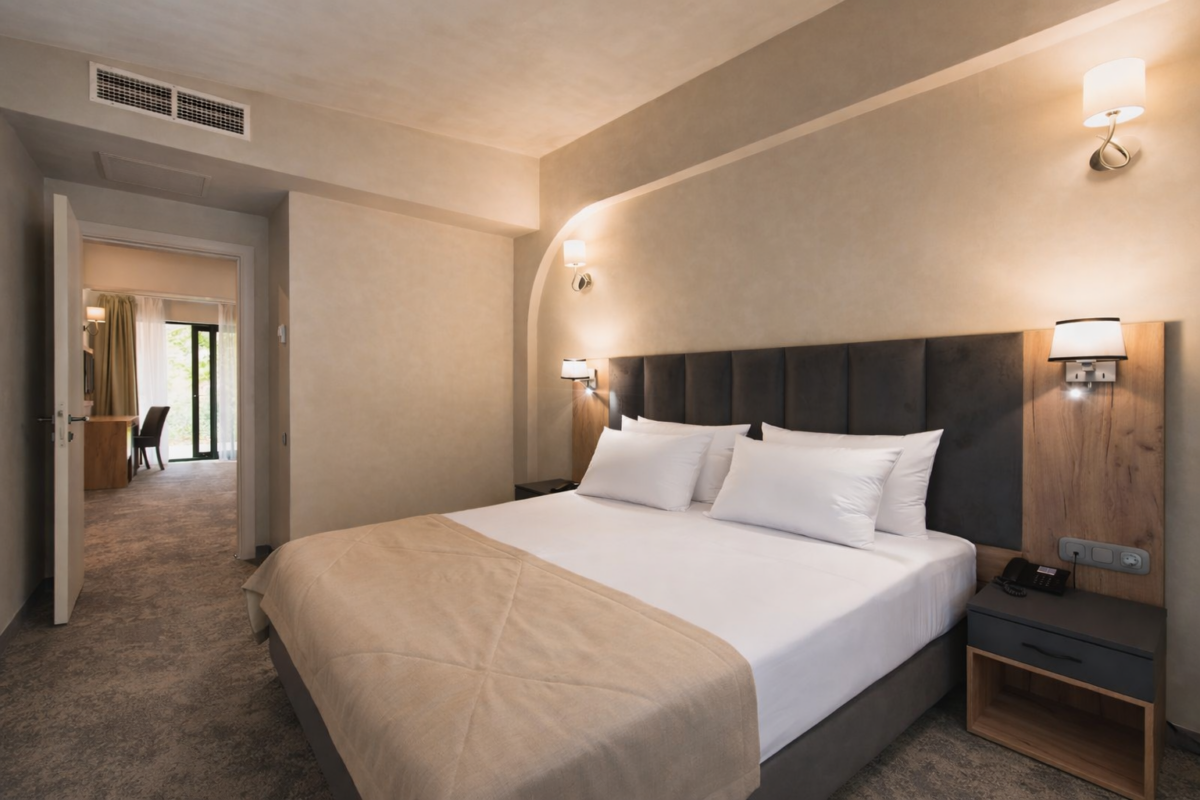 Просторный однокомнатный или двухкомнатный номер общей площадью 40 м² с видом на бассейн в сторону моря. Однокомнатный номер условно разделен декоративной портьерой на две зоны: гостиную и спальную зону. Номер имеет большой балкон. Ванная комната оснащена ванной-джакузи. В двухкомнатном номере балкон находится на уровне с газоном. Тип кровати – двуспальная. Ванная комната оснащена душевой кабиной. В номере установлен раскладной диван или кресло.