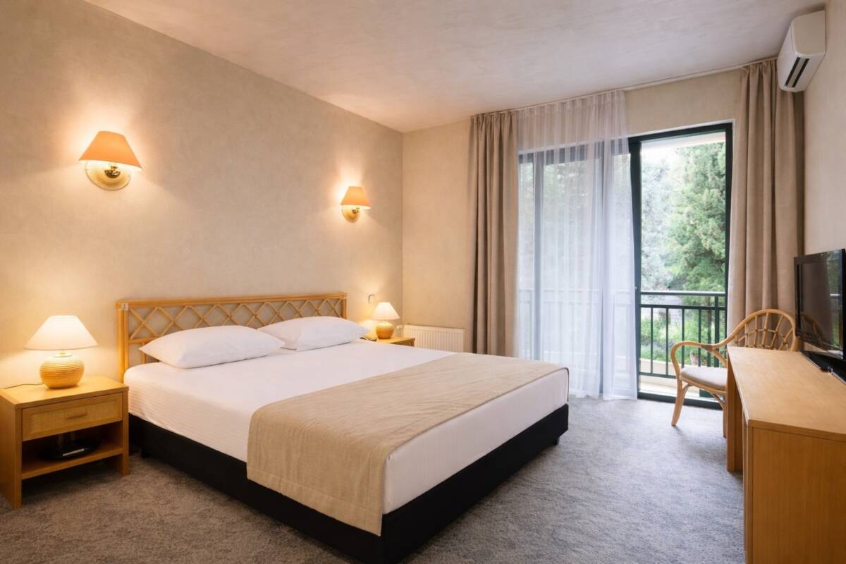 Однокомнатный номер общей площадью 16 м² с видом на парк или на море через деревья. Номер с французским балконом. Тип кровати – двуспальная. Ванная комната оснащена ванной.
