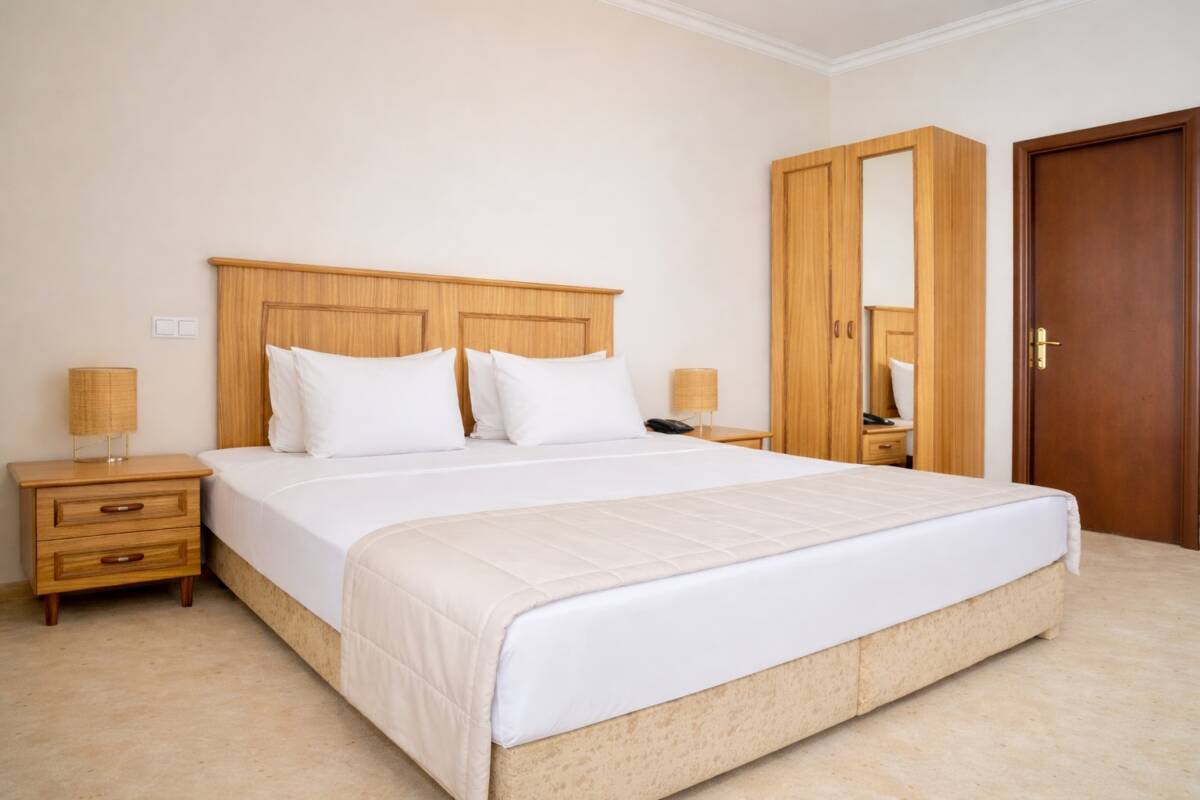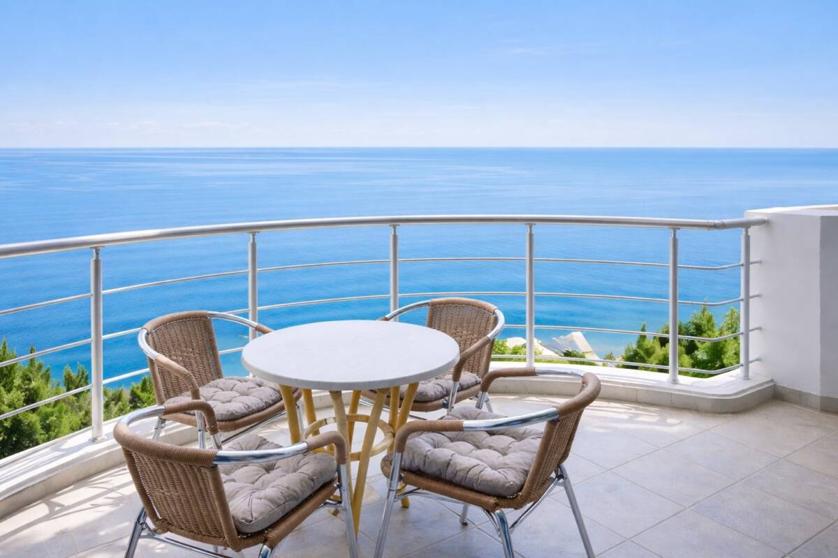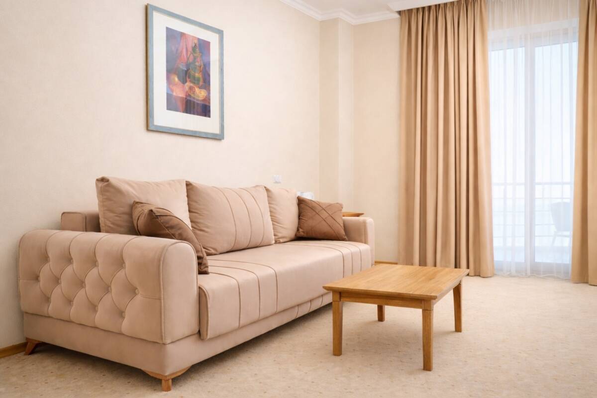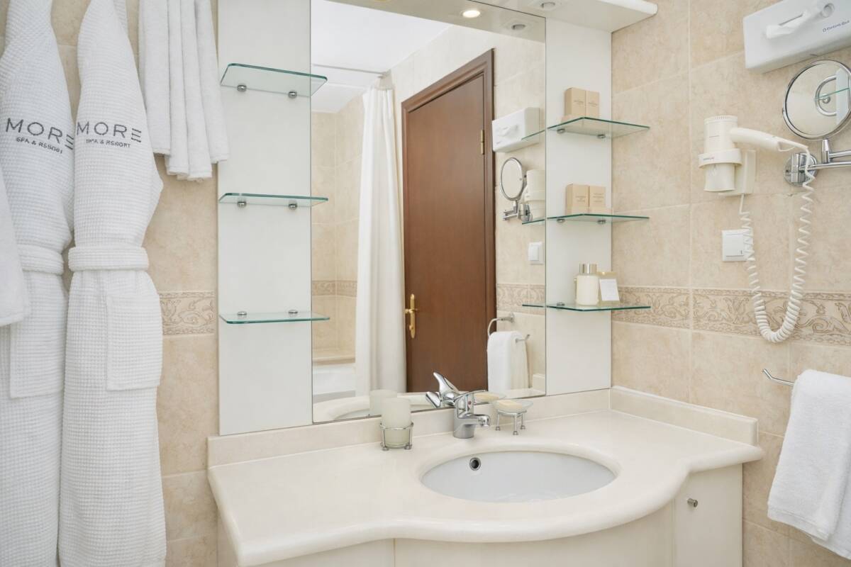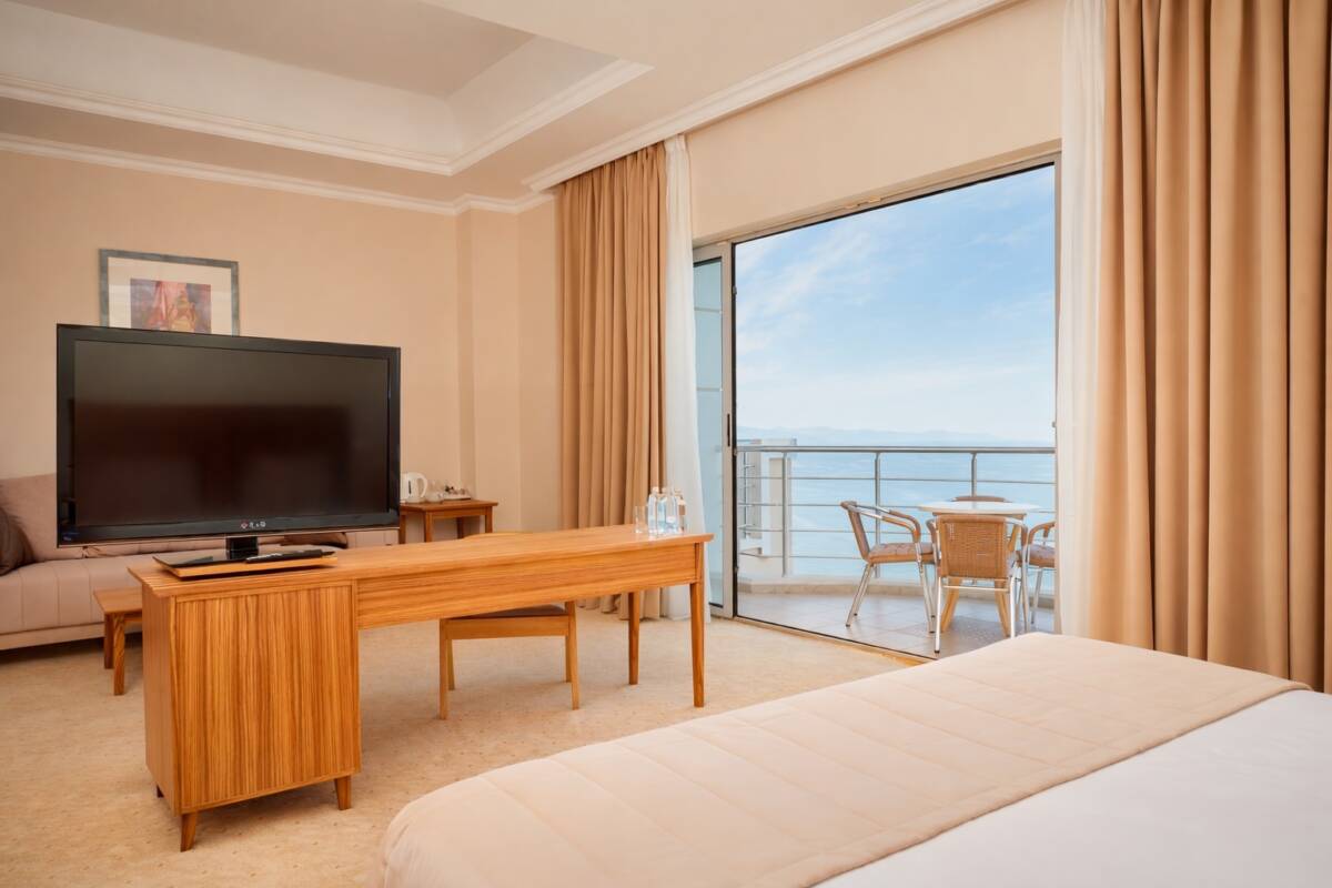 Просторный однокомнатный номер с панорамным видом на море общей площадью 52 м². Номер условно разделен на гостиную и спальную зоны. Имеет балкон с выходами из спальной и гостиной зоны. Тип кровати – двуспальная. В гостиной установлен раскладной диван. В номере находятся 2 ванные комнаты, одна из которых оснащена ванной, другая – душевой кабиной.