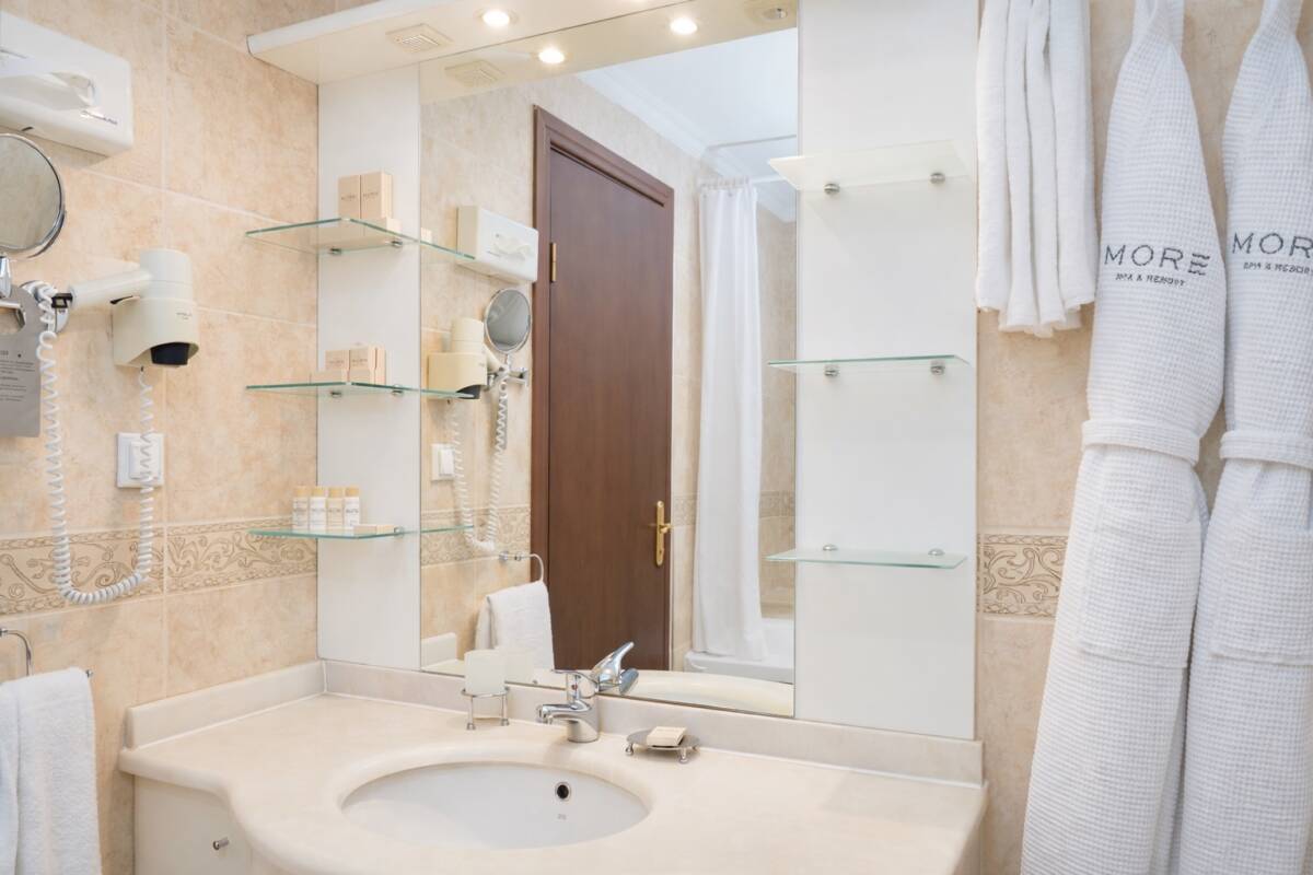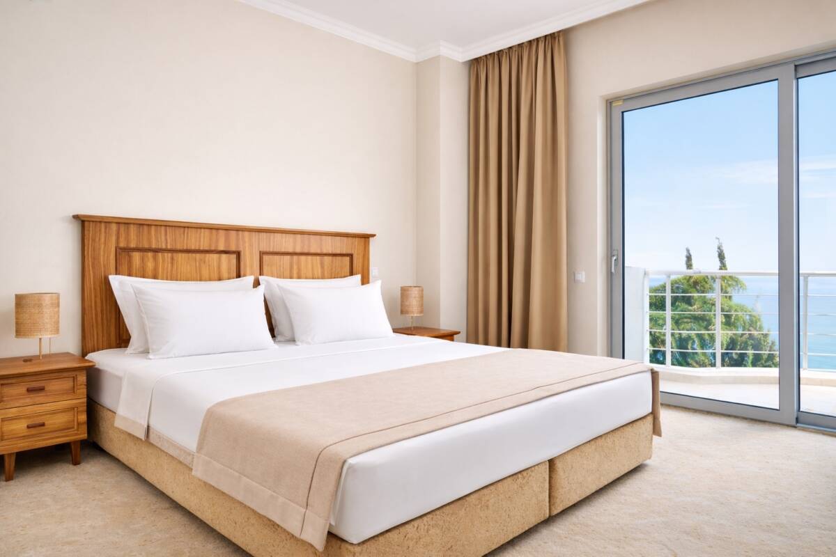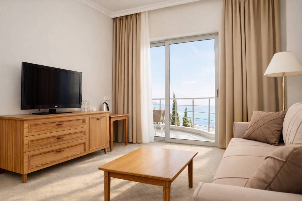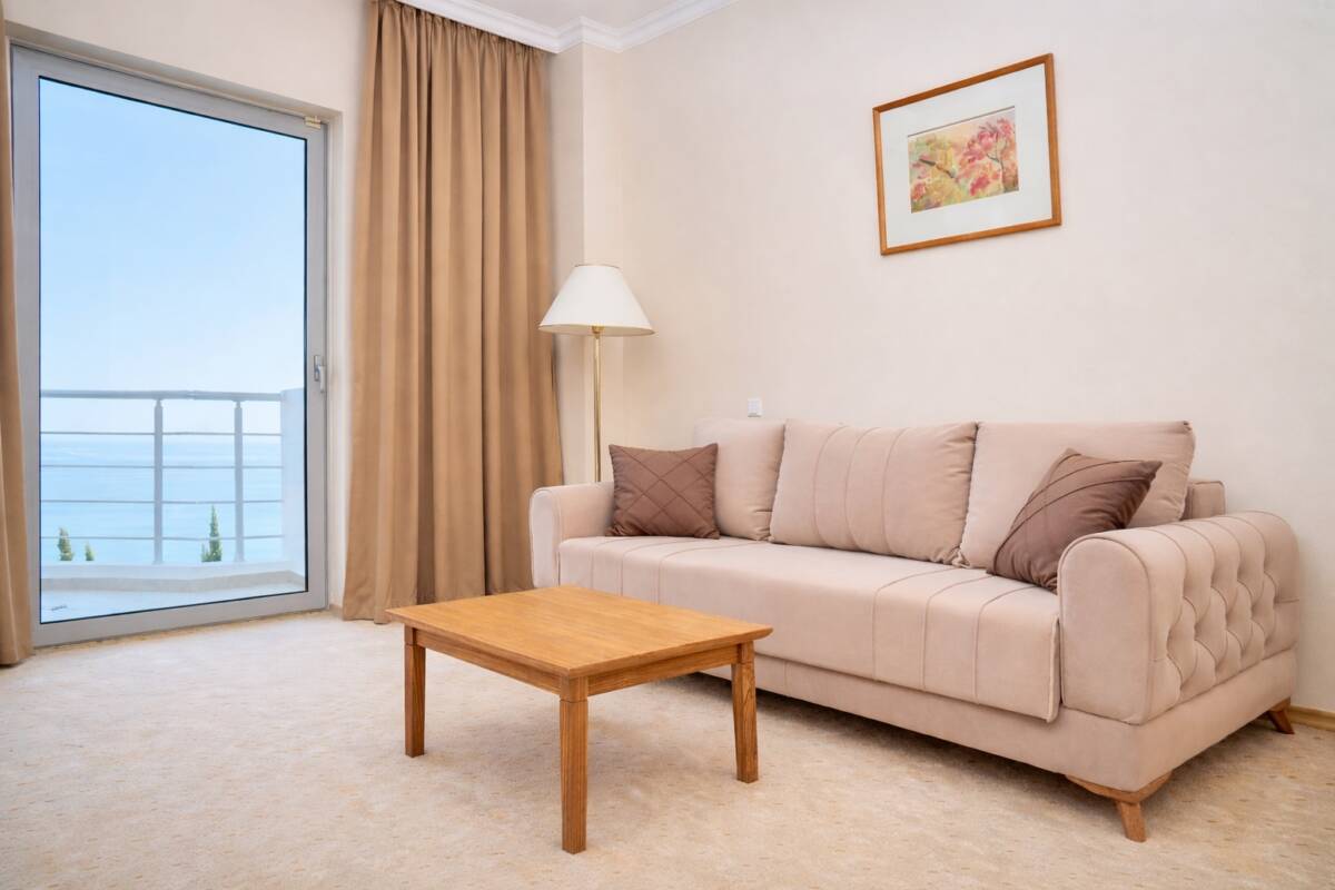 Двухкомнатный номер с видом на море общей площадью 52 м². Номер состоит из гостиной и спальни. Номер имеет балкон с выходами из спальни и гостиной. Тип кровати – двуспальная. В гостиной установлен раскладной диван. В номере находятся 2 ванные комнаты, одна из которых оснащена ванной, другая – душевой кабиной.