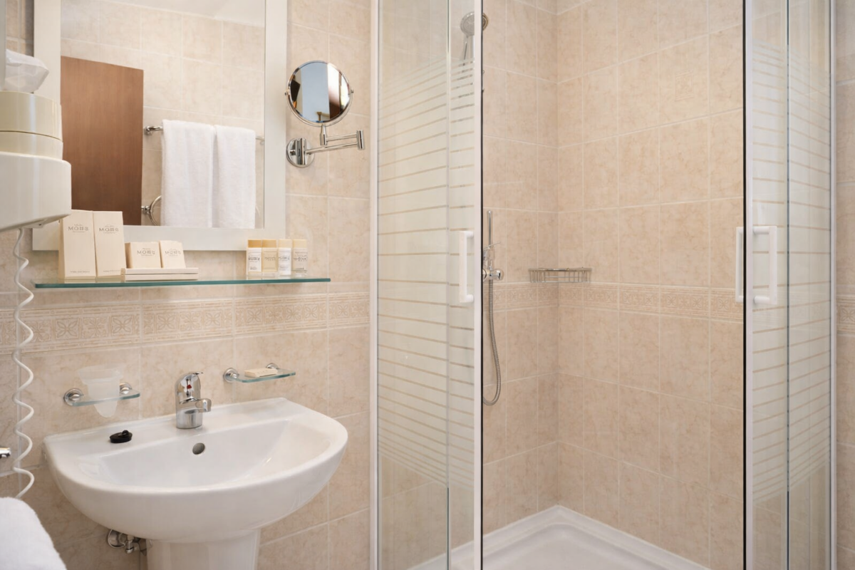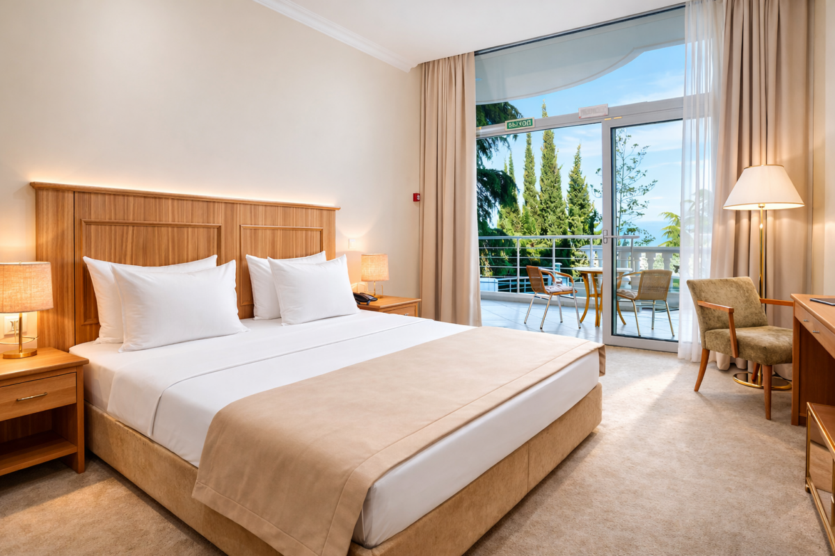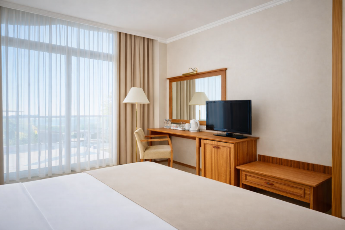 Однокомнатный номер общей площадью 22 м² с видом на море и бассейн. Номер без балкона. Тип кровати – две односпальные кровати, которые по системе твин возможно объединить в двуспальную. Ванная комната оснащена душевой кабиной.